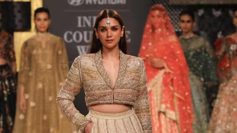 Actress Aditi Rao Hydari was seen on the ramp of India Couture Week, organised by the Fashion Design Council of India (FDCI). She is representing the famous designer Ritu Kuamr’s take on modern look with a touch of vintage authenticity. On the second day of the Indian Couture Week, Ritu Kumar stunned the audience with her collection this year and her incredible fashion creation.