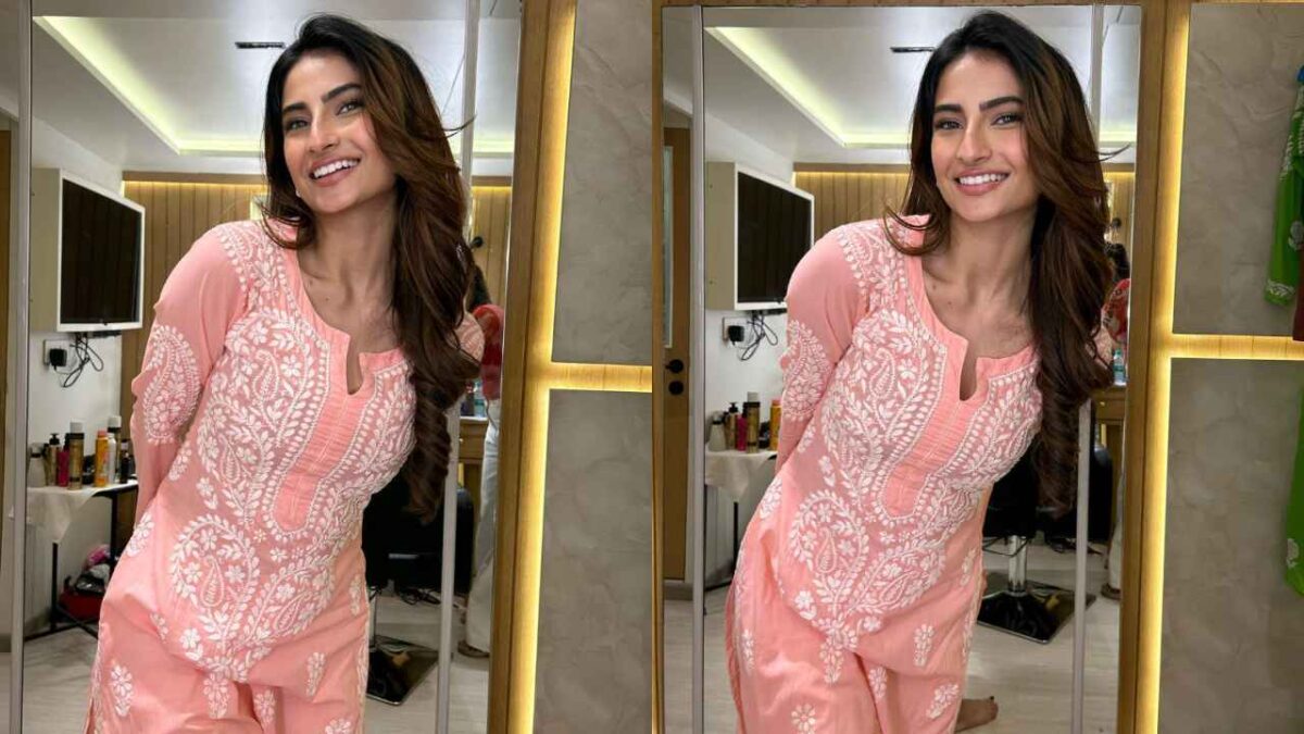 The actress from ‘Kisi Ka Bhai Kisi Ki Jaan’ opted for a long peach-colored kurta set paired with white pants featuring white floral chikankari embroidery and a gracefully deep neckline. She complemented her attire with understated yet fashionable gold hoops. This ensemble serves as an excellent choice for a simple and sophisticated Ganesh Chaturthi look.