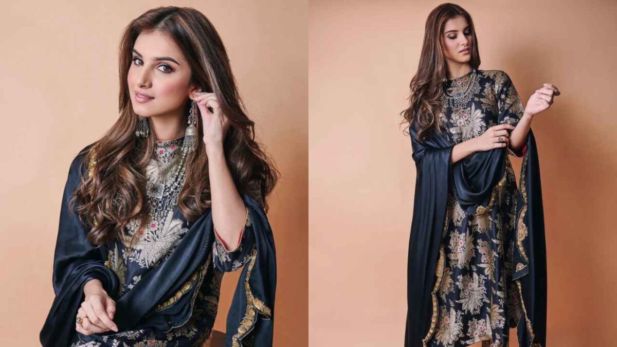 The actress from ‘Student of the Year 2’ looked stunning in a dark blue kurta set. Her simple kurta was adorned with a golden traditional floral print and featured 3/4th sleeves. She paired it with straight-legged pants in the same print. Adding to the elegance, she draped a matching dark blue dupatta with an embroidered gold border. Completing her look, she wore a silver Afghani-style necklace along with intricately designed silver earrings. Doesn’t this outfit seem tailor-made for the festival? We’re absolutely enamored with it!
