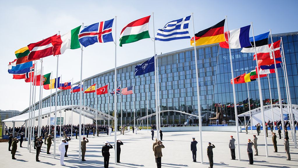 Finland’s blue cross on a white background flag was hoisted next to the alliance’s 30 member states in the military bloc’s Brussels headquarters as a band from the military played.